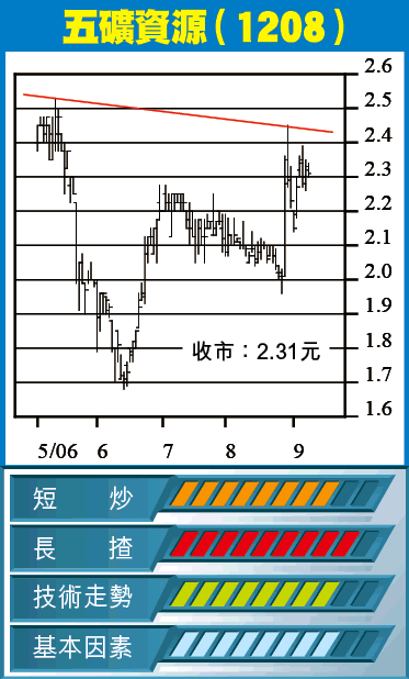 搵短炒對象,五礦資源(1208)夠條件,有機會升20%至30%。五礦由低位回升,形成上升三角形,上周五收2.31元,已在10日線(2.25元)、20日線同50日線(俱在2.16元水平)之上,升破2.34元阻力,短期目標2.78元,升幅20%。
