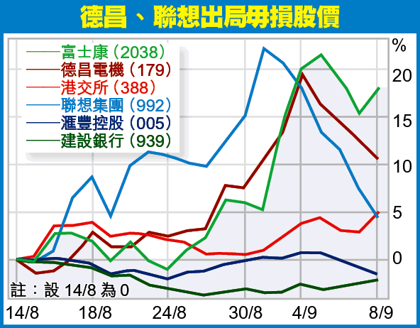 上月當恒指服務公司宣布更換成份股後,筆者便在本欄以「趁恒指換馬執平貨」為題(8月16日),建議投資者趁機吸納被剔出成份股的兩隻股份。現在回看,筆者當時的建議亦不太差,附圖是3隻加入恒指的新貴建行(939)、港交所(388)及富士康(2038),以及兩隻被剔出的股份德昌(179)及聯想(992),再加1隻比重被降低的大笨象滙控(005)的走勢比較圖,圖中可見,由宣布更換成份股至今,兩隻被剔出的股份表現不俗,一度飆升達20%,當中尤以聯想升勢最勁,由宣布剔出時的2.70元,一度升至高位3.28元,升幅與富士康不遑多讓,故明年不要錯過那些出局股份。至於兩隻加入成份股的新貴,則表現平平,尤其是筆者持有的建行,竟無寸進,希望加入成份股後,買盤完結,它再跌多一些,讓筆者可再低吸多一點,反正不夠貨。
