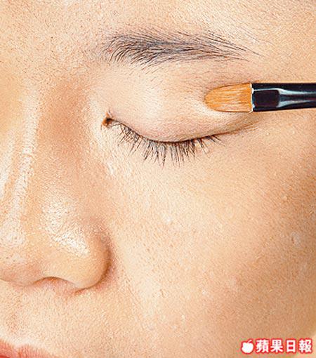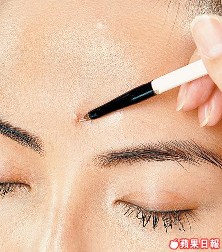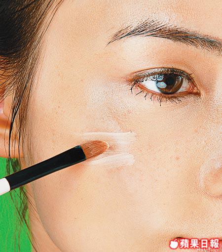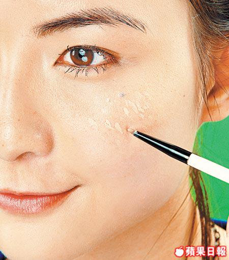 忽起的暗瘡可用尖頭掃於中間位置點厚,之後再用手指印好邊緣。凹位的遮瑕方法相近,同樣先填平後印開。