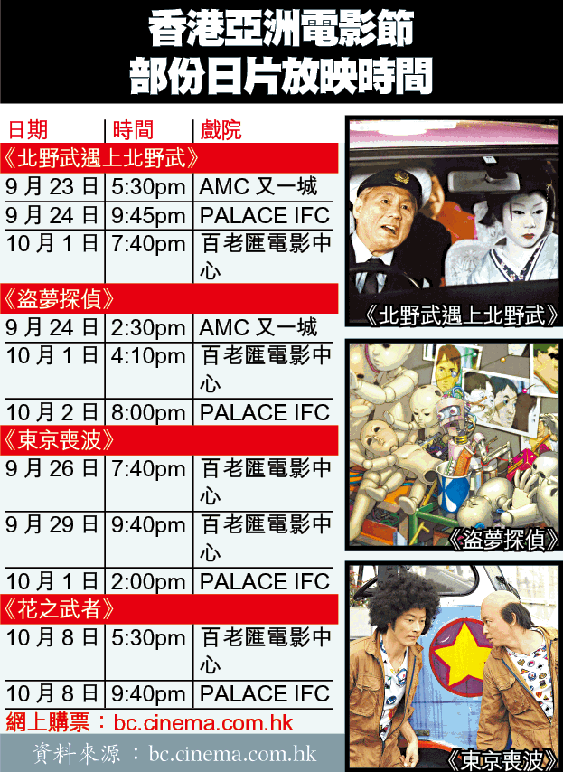 除此以外,北野武自編自導自演的搞怪新片《北野武遇上北野武》、「NANA」宮崎葵與日本小生小出惠介合演的愛情片《三億日圓極盜初戀》、淺野忠信突破形象以爆炸頭主演的搞笑喪屍片《東京喪波》,還有小泉今日子與伊勢谷友介合演、囊括東京國際電影多個大獎的《向雪許願》也獲安排率先上映。至於日本著名動畫家今敏繼《東京教父》後的動畫片《盜夢探偵》,門票差不多售罄,氣勢絕不遜於閉幕片《花之武者》。