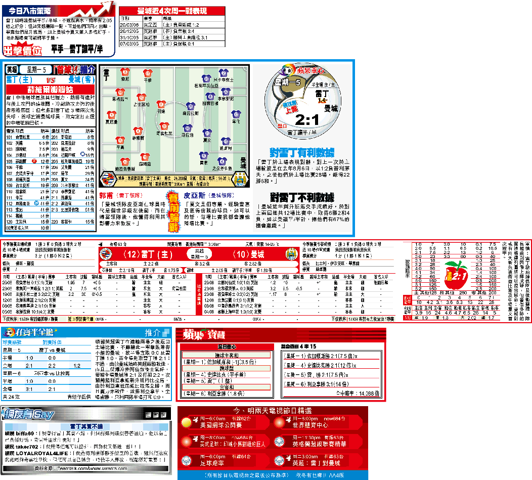 「讓球盤」雷丁讓平/半,上盤可取,合心水的朋友更可以博雷丁單W,有2.2倍。波膽方面,由於兩隊陣中都不乏懂入波人馬,可敲雷丁勝2:1或3:1,而總入球則當然要「大」。