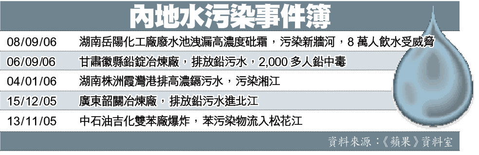繼日前甘肅徽縣鉛中毒事件後,湖南岳陽縣城8日亦因附近一化工廠污水洩漏,導致大量高濃度砷化合物(俗稱砒霜)污水流入當地飲水源新牆河,使河水砒霜含量超標10倍,嚴重威脅當地8萬多名居民的生命安全。
