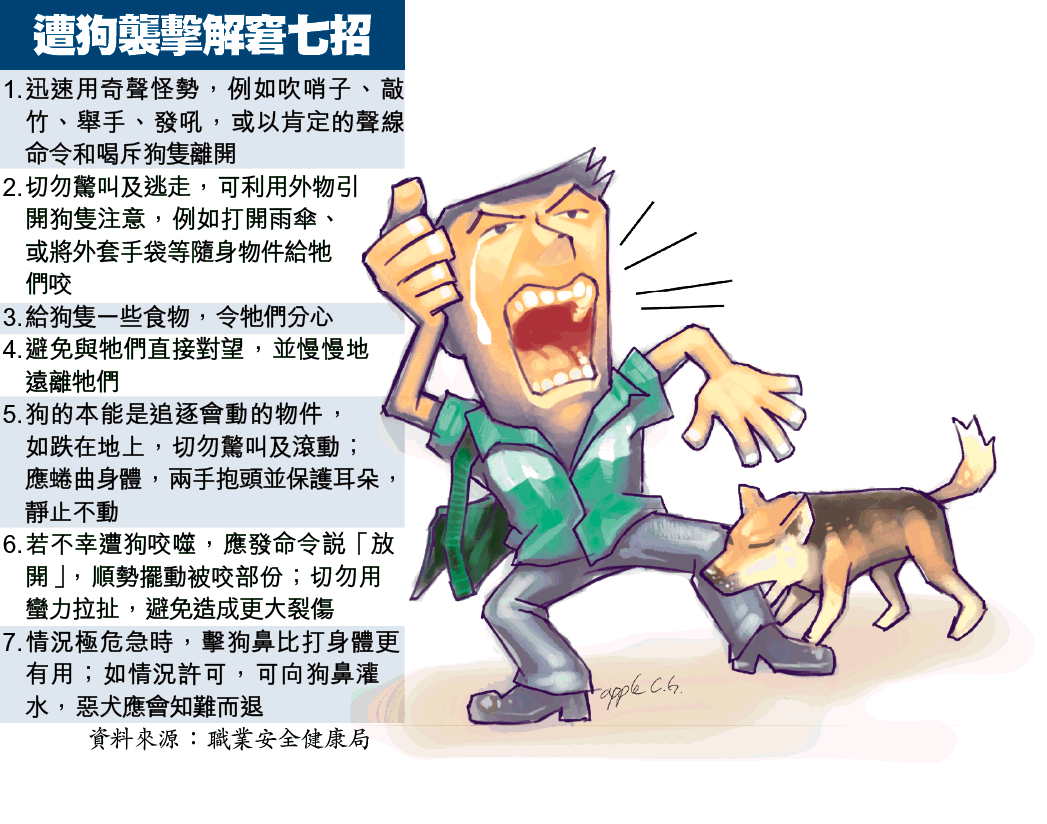 【本報訊】狗被形容為人類最好的朋友,但原來漁農自然護理署在過去5年錄得6,618宗狗隻咬人個案,每日平均有逾3人被狗咬傷。一些因職業關係而要與狗隻接觸的人士成為被咬高危一族。職業安全健康局稱,一隻體重20公斤的狗足可發出180公斤咬力,是成人咬力的9倍,該局特別提出一套狗隻「鑑貌辨色」法,以減低市民被狗咬傷的風險。