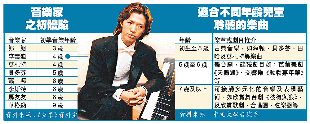 中文大學駐校藝術家MaryWu指,一般情況下,兒童不宜過早學音樂,因幼兒手部仍在發育中,手骨未長好又不夠力,建議兒童三歲才學鋼琴,至於小提琴因所需要的姿勢較為複雜,兒童五、六歲時才開始學習較為適合,但亦需視乎兒童所具的潛質決定。