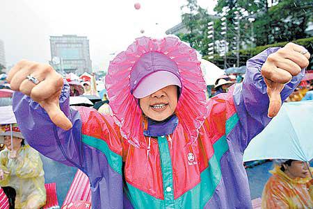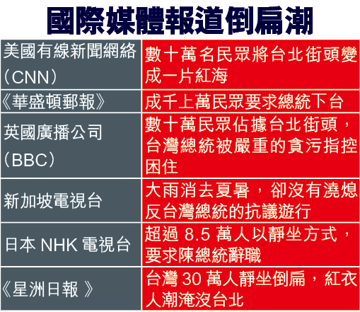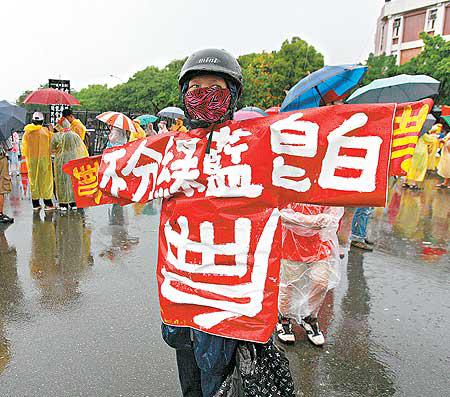 以中產人士為主的台灣百萬人倒扁靜坐行動昨踏進第二天,滂沱大雨下,倒扁遊行一度叫停,總指揮施明德又抱恙不適,參加人數急降至萬餘人。群眾不安情緒浮現,激烈行動開始醞釀,有人揚言自焚;亦有藝人號召「911反扁大罷工」,倒扁總部表示,罷工、罷課是將來可能考慮方案之一,歡迎群眾請假,繼續參加靜坐。