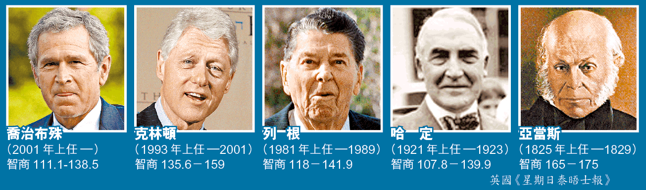 帶領國人走過911悲痛、打起反恐戰的現任美國總統喬治布殊(GeorgeWBush),在110年以來的總統智商(IQ)榜上,可能是倒數第二。