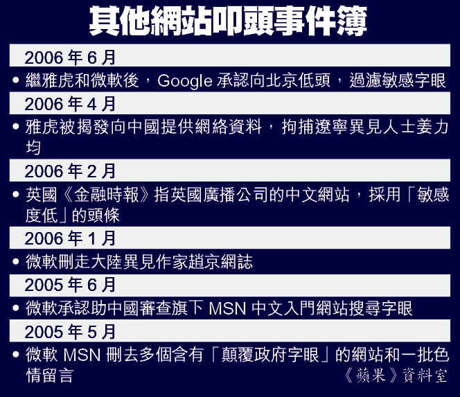 「資訊是禁不了的!」面對中共強權淫威,雅虎(Yahoo)屈服了,微軟(Microsoft)洩氣了,就連口口聲聲「不為惡」的谷歌(Google)也要搖尾乞憐,為中共過濾互聯網的「敏感」資料,只有維基百科(Wikipedia)咬緊牙關挺着原則,就算去年10月被禁至今,創辦人威爾士(JimmyWales)仍堅拒審查網站內容,甚至計劃游說中國官員。