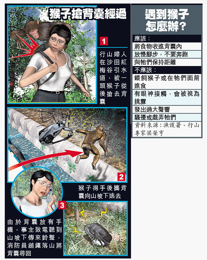 【本報訊】沙田紅梅谷發生惡猴搶背囊事件,一名行山婦人,被猴子搶去背囊,惡猴得手瞬即遁入山林,由於背囊內放有手機,成為尋背囊線索,最後由消防員憑鈴聲縋繩落山坡將背囊撿回,肇事的猴子則不知所終。遇事婦人一度受驚哭泣,但毋須送院。 記者:文兆麟