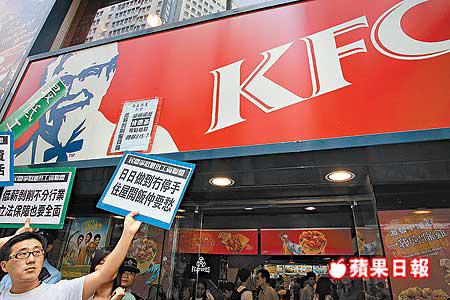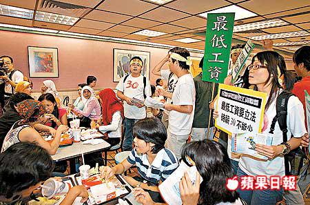 【本報訊】民間爭取最低工資聯盟57名參與絕食30小時的代表及數十名聲援人士,昨日在絕食結束前最後兩小時,到銅鑼灣街頭舉行巡遊,其間先後進入四間連鎖快餐店及超級市場派發單張及叫喊口號,抗議大商家以低薪聘請員工,一度被職員驅趕。