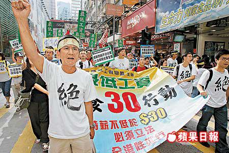 代表27個勞工團體的57名絕食人士經歷一晚的飢寒後,於昨午5時結束絕食行動。他們在結束30小時絕食前的兩小時,與數十名到場聲援的市民於銅鑼灣街頭舉行遊行。遊行人士叫喊「日日做到無停手,住屋開飯總要愁」、「特首只顧商家,漠視基層困苦」等口號,要求當局盡快訂立時薪不低於30元的最低工資。