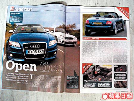 揭番本書前少少,又一個好Topic啱我口味。係咩?咪係全新AudiRS4開篷跟Mercedes-BenzCLK63AMG大對決囉;講真,我覺得兩部車個造型都係咁煞食,不過有個超大鬼面罩嘅RS4開篷,襯埋車頭泵把連整流器,真係惡到無人有;但性能方面則以CLK63AMG優勝得多,梗係啦,部車用嘅係6.2公升V8偈,無高達481bhp嘅馬力又點見人呢,係咪?