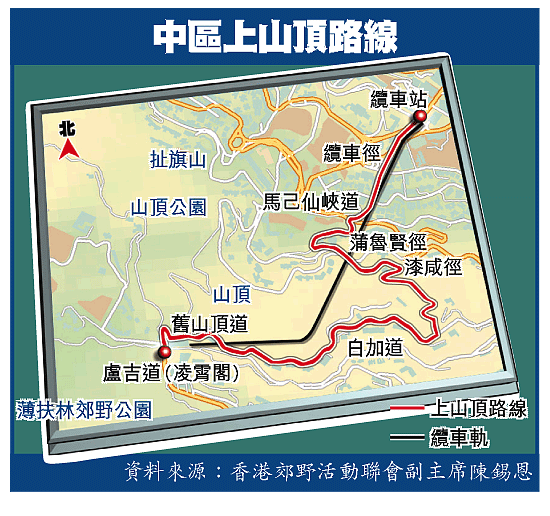 香港郊野活動聯會副主席陳錫恩說,由中區步行上山頂的路徑,林蔭處處,就算天氣稍熱也不怕,路面平坦又不算太陡斜,適合一家大小同行。他認為最方便是經中區自然徑,即由纜車站出發,沿纜車徑拾級而上,經白加道到山頂凌霄閣(見圖)。