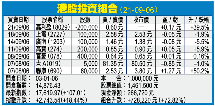 廣南(1203)近期成交疏落,連續多日嘜在1.38元收市,隻股基本因素無問題,現價亦非偏高,但不知何時再開車,若有其他更好的選擇,會沽貨套現換馬。富豪(078)公布完業績後走勢轉淡,昨收0.65元,跌0.01元,若走勢無改善會沽出換馬。