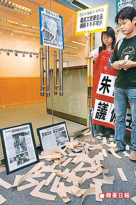 【本報訊】「最低工資要立法,時薪30不可少!」職工盟十多名成員昨日前往香港僱主聯合會位於銅鑼灣的辦事處請願,抗議聯合會阻撓最低工資立法,代表在該會門前貼上印有僱主聯合會執行委員會主席陳祖澤相片的標語,諷刺他是最可恥的僱主(圖一),因他屬下的九巴被揭發以8.3元時薪聘請外判清潔工。