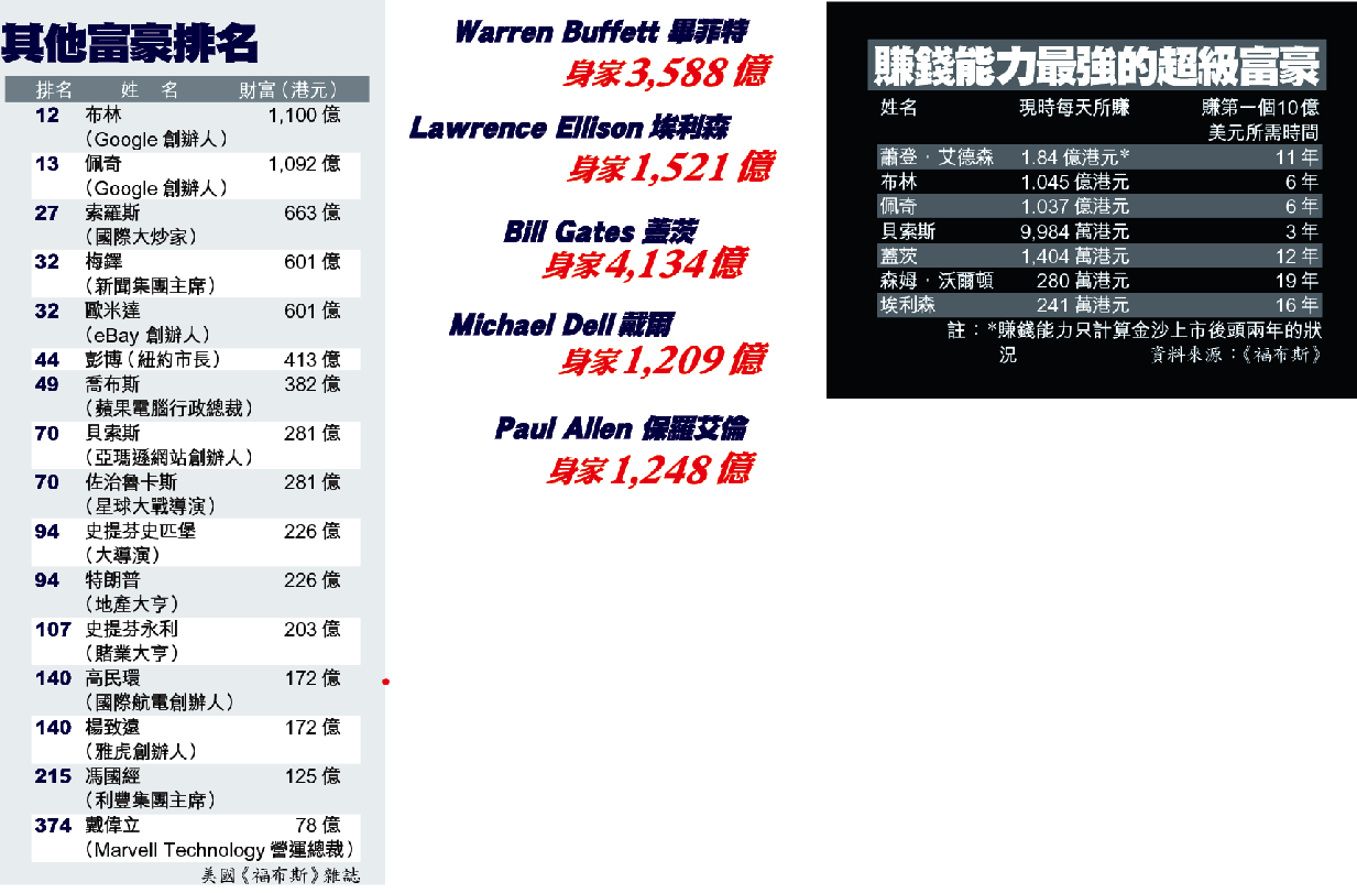 《福布斯》昨天(周五)公布美國富豪榜,頭兩名都是大家耳熟能詳的一對好友。微軟主席蓋茨(BillGates)連續13年當上首富,財富530億美元(4,134億港元)。今年剛宣布捐身家做慈善兼再婚的「股神」畢菲特(WarrenBuffett),去年財富暴增60億美元(468億港元),達到460億美元(3,588億港元),不過仍未追得上蓋茨,今年繼續屈居第2。