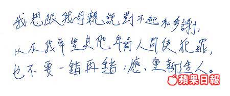 發生今次事件之後,除了多謝大家的關心之外,最想多謝的是媽媽,很想說聲:「媽媽,對唔住。」我知道你非常關心我,多謝你對我的不離不棄,我應承你我一定會努力讀書,將來成為一名社工或者教師,幫助人之餘,可以與人分享我的經歷。