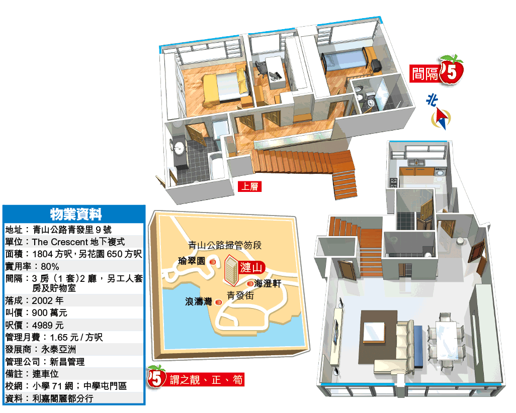 利嘉閣周樂表示,漣山TheCrescent樓高6層,地下連花園複式放盤約5個,呎價4600至5900餘元,介紹的單位花園雖較小,但全屋已翻新,裝修有特色,呎價約5000元,具競爭力。此外,其他複式放盤有5個,呎價3700至4600元。