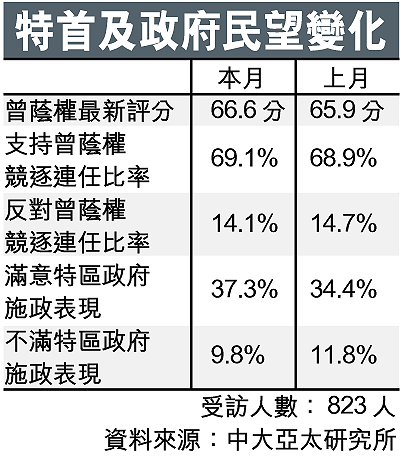【本報訊】特首曾蔭權民望續升,中大香港亞太研究所本月20至22日,向823位市民進行的調查顯示,曾蔭權最新評分為66.6分,較八月份微升0.7分。假若沒有其他可能候選人,高達69.1%受訪者表示支持曾蔭權競逐連任,較上月微升0.2個百分點;表示不支持曾連任者只有14.1%,較上月下跌0.6個百分點(見表)。