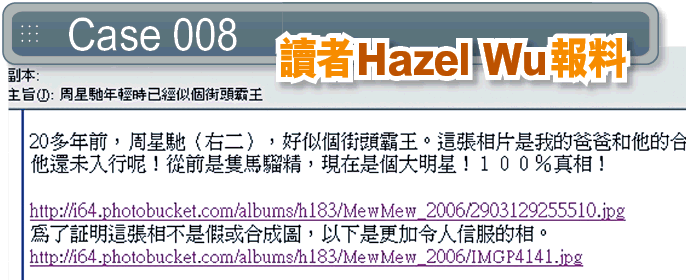 本報「ClickClick情報科」日前接獲讀者HazelWu報料,指她父親20多年前與周星馳認識,Hazel並提供了一張她父親與星爺及兩名友人的陳年合照,以及一張她父親拿着舊照片拍攝的照片,以證明她父親當年確認識星爺。
