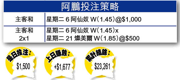 波圖喺葡超超班,不過歐冠盃強手林立,上場佢主場對莫斯科中央陸軍,都係互無紀錄;仲有上屆歐冠分組賽,佢淨係贏過1場,最終做小組包尾黯然出局,而以波圖今季人腳,要同時應付聯賽同盃賽,的確令人懷疑,所以今場揀阿仙奴贏波絕對正路,一於揀主客和嘅主勝。
