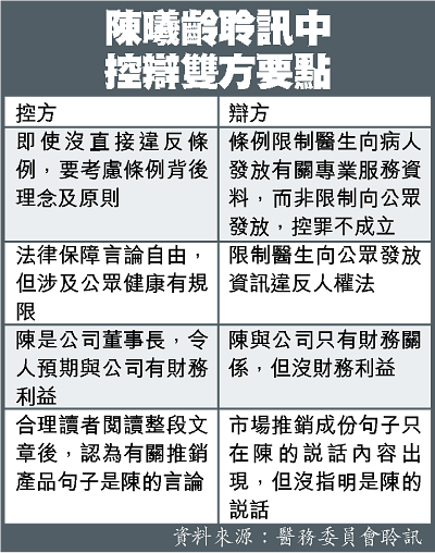 醫委會昨日對案件進行第二日聆訊。辯方律師作供時稱,控方援引的條例規範了醫生向病人發布有關專業服務的資料,但陳是向公眾人士而非病人發放健康資訊,故不構成專業失當。