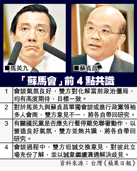 「蘇馬會」會前的預備會議昨晚5點半開始至7時結束。國民黨文傳會主委黃玉振,會後代表雙方對外宣布,「蘇馬會」因各有立場,意見不一,無法召開,但雙方對於化解當前政爭僵局,均有高度期待,目標一致,並有誠意繼續溝通。至於有關蘇、馬二人究竟是單獨會面還是進行政黨多人會商,以及國民黨是否應先暫停推動總統罷免案這兩項分歧,將各自帶回去研究。