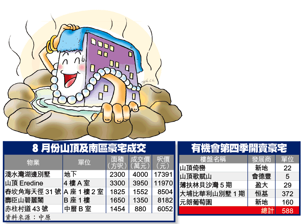 【本報訊】山頂及南區豪宅交投自8月份明顯轉旺,不過成交集中二、三線豪宅,但踏入9月大碼豪宅買賣亦重新發力,豪宅市況有升溫迹象;隨着多個豪宅盤計劃第四季登場,業界估計,成交量進一步增加,造價料較第三季升5至8%。