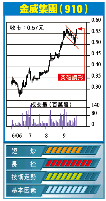 金威剛做完路演,聞說基金反應好熱烈,股價亦由低位回升,在0.58元水平有機會略為整固,破位而上後,下一個目標將係0.80元。