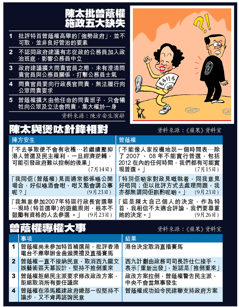 陳太暗批曾蔭權專權,實非無的放矢。有公務員批評,曾蔭權接任特首後,經常繞過架構獨斷獨行,例如堅持西九龍文娛藝術區要興建天幕;在添馬艦建政府總部問題上堅拒向政黨讓步,公務員參與度極低。