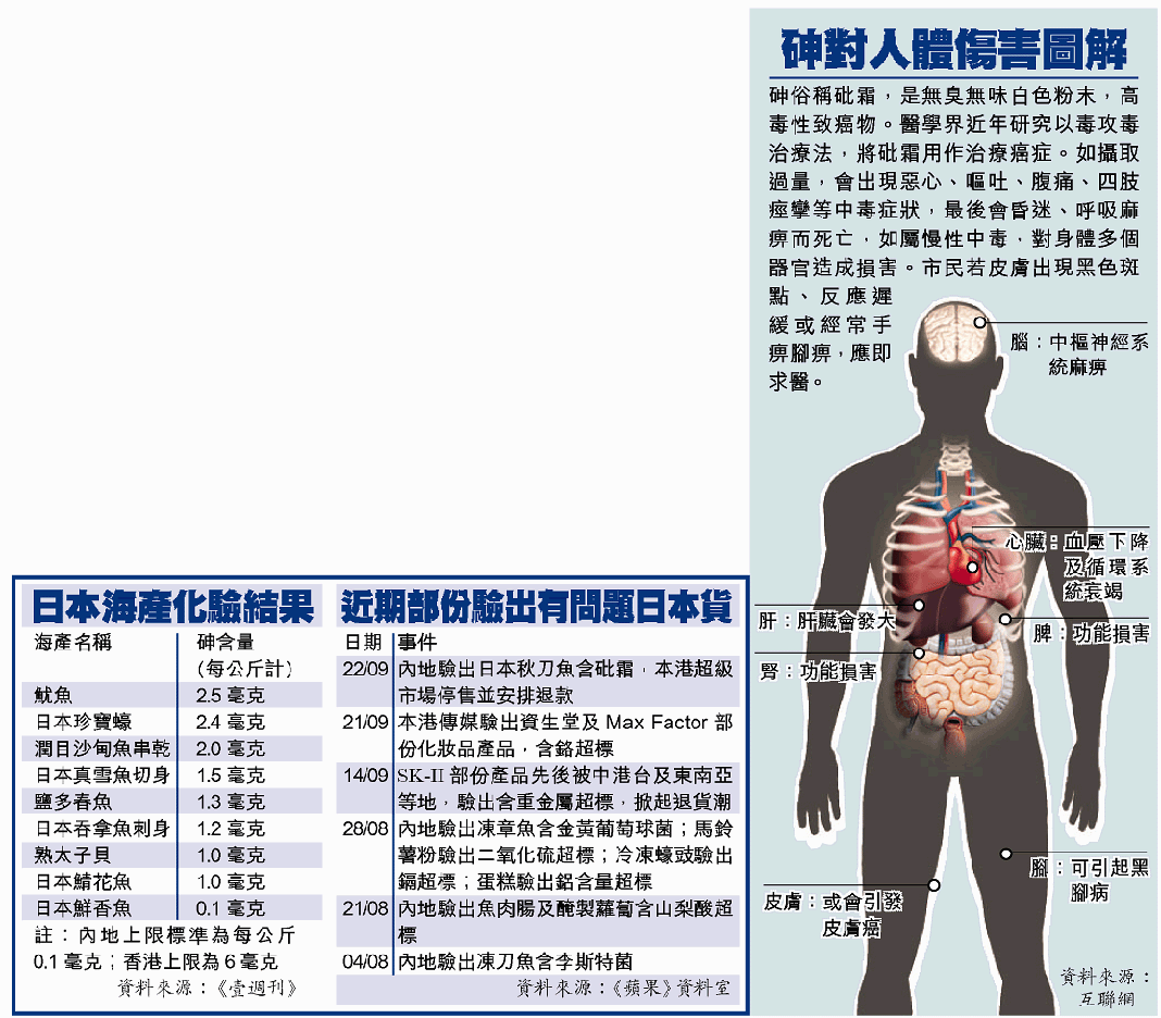 食物環境衞生署轄下的食物安全中心發言人稱,本港現時食物中砷含量管制水平,足以保障公眾健康,並指出國際組織「食品法典委員會」(CODEX)並沒有訂定標準海產的砷含量,各地食物安全機構均自行訂立標準。不過食環署未能交代本港所訂標準的依據。中文大學生物化學系副教授陳竟明表示,砷存在於泥土和岩石中,若是砷慢性中毒,會因血管變得粗黑而患上黑腳病,或因砷取代血管中的磷而導致肝臟肥大,甚至致癌。