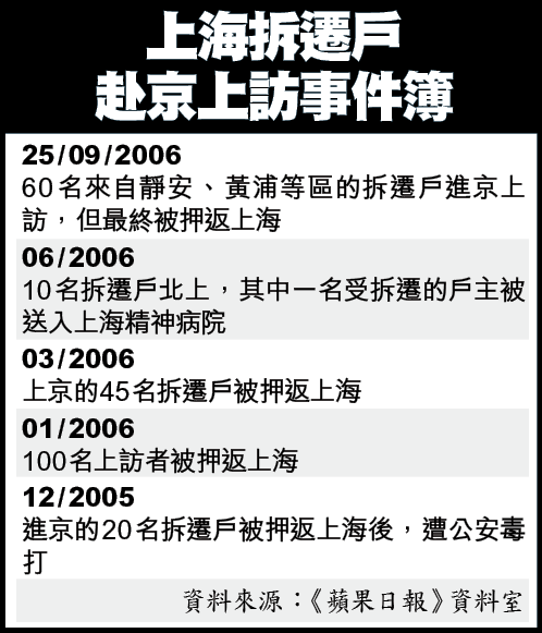 昨日在京上訪的另一批上海拆遷戶,卻被數名來歷不明的人士圍毆,當中60多歲的上訪者王惠芳竟被四名男子拳打腳踢,其後更被帶走,至今下落不明。而由25日至今,每日均有逾80名上海拆遷戶到北京上訪,亦全部被警方帶走。