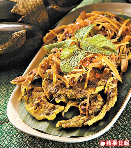 每碟兩隻軟殼蟹,沾薄粉炸,多膏香口,鋪面嘅泰國青芒絲混入香茅片、南薑、檸汁、檸檬葉、蝦米、指天椒、魚露、青葱一齊炒,酸酸辣辣口感好豐富。