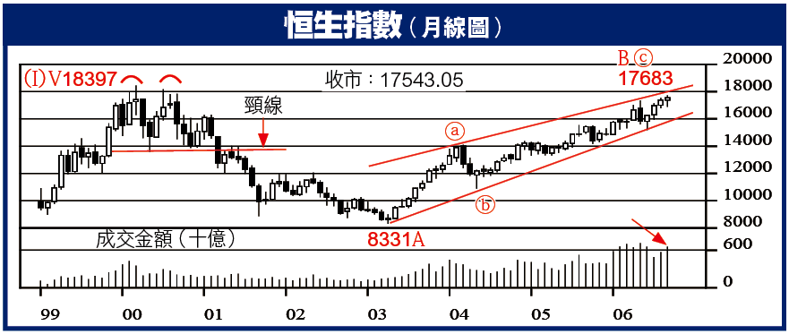 先以宏觀走勢分析大市。2000年3月,恒指最高18396,出現黃昏之星,及形成雙頭走勢完成(Ⅰ)V浪升勢,大跌至03年最低8331,共下跌10065點,跌幅54.7%,由於進入(Ⅱ)浪跌市,估計以A、B、C浪運行,而A浪跌至03年,以8331見底。