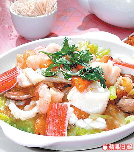 自製魚肚索滿濃濃上湯,餡料有蟹柳、魷魚、鮮蝦同魚肉,味清淡但健康,餸飯一流。