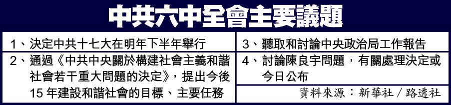上月24日,中央政治局決定免去「上海一哥」陳良宇擔任的上海市委書記職務,並停止其政治局委員、中央委員職務。不過,依據中共黨章的規定,撤銷政治局委員、中央委員的職務,須經中央全會表決,外界相信六中全會將確認政治局上月的決定。