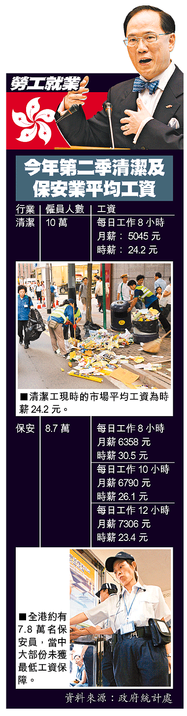 現時全港共有10萬名清潔工及8.7萬名保安員,當中有3萬人是政府外判合約工,他們已享有最低工資,其餘16萬人則未受保障。統計處資料顯示,今年第二季清潔工平均時薪為24.2元,保安員則由23.4元至30.5元不等。
