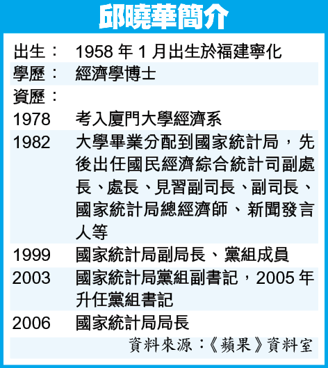 在「上海一哥」、前市委書記陳良宇被革職後,國家統計局局長邱曉華突然被國務院免職。官方新華社昨晚披露,國務院發展研究中心副主任謝伏瞻已被任命為國家統計局長。剛在今年3月擔任統計局局長的邱曉華,坐上統計局局長的位子僅半年就被免職,令市場感到突然。而邱曉華夫人昨日在接受記者查詢邱的狀況時,態度極之不耐煩,並以「不知道」作回應。