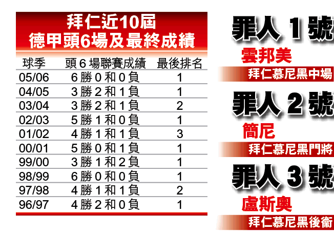 拜仁可在歐冠盃分組賽兩戰全勝,其中更作客贏意甲國際米蘭2:0,足證他們是有實力的。事實上,今夏他們雖走了兩中場猛將波歷克及薛羅拔圖,但來了後衞雲拜頓、中場雲邦美及前鋒普多斯基,加上原有的門將簡尼、後衞拿姆、中場舒韋恩史廸加及前鋒馬卡爾等,戰鬥力仍冠絕德甲聯,實在沒理由在頭6仗失掉8分。在主場對紐倫堡以及作客對比勒費爾德和禾夫斯堡這3仗上,他們都顯然有輕敵之心,未有認真比賽,結果自食其果。