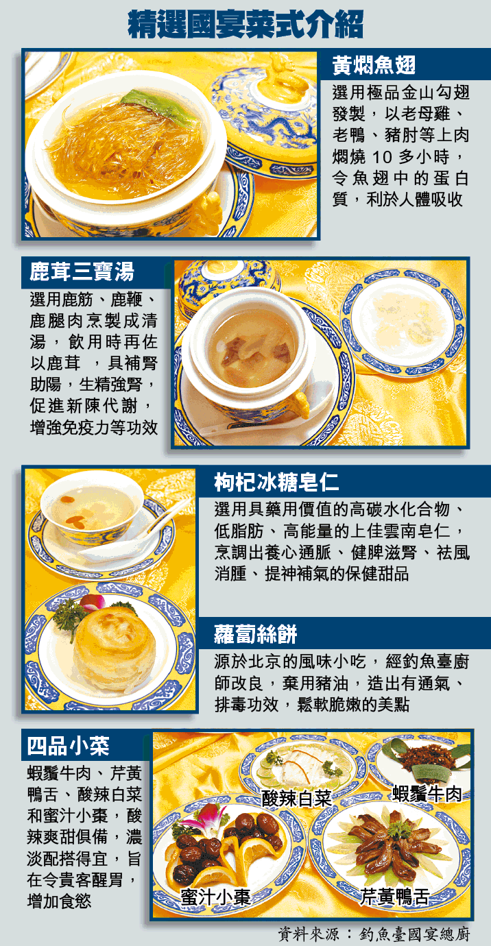他昨日特別精選五道國宴菜式向記者介紹,他說炮製「黃燜魚翅」,每條長15吋的金山勾翅只選出中間一段,要兩天前準備,燜燒十多小時;促進人體新陳代謝,增強免疫力的「鹿茸三寶湯」,是由滿州引入的湯水,亁隆指定的御宴;「枸杞冰糖皂仁」更是低脂肪、高能量的保健甜品;源於北京風味小吃的「蘿蔔絲餅」,經釣魚臺廚師改良,棄用豬油後,仍能造出鬆軟脆嫩,吃得健康的美食;還有國宴逾100種的冷盤小菜其中4款。
