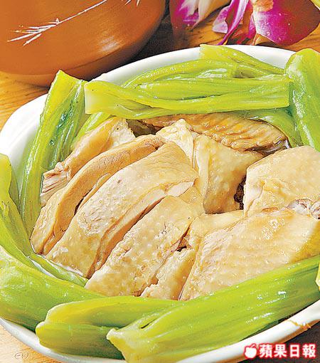 做法:煲滾上湯,放入雞翼及雞髀以大火煮5分鐘,熄火後浸熟,保持肉質嫩滑,後汆水斬件上碟。菜膽以上湯灼熟後伴碟邊,埋芡汁淋上面即成。