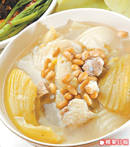 材料:黃豆2両、大芥菜1斤、腩排8両、清水4杯、鹽少許