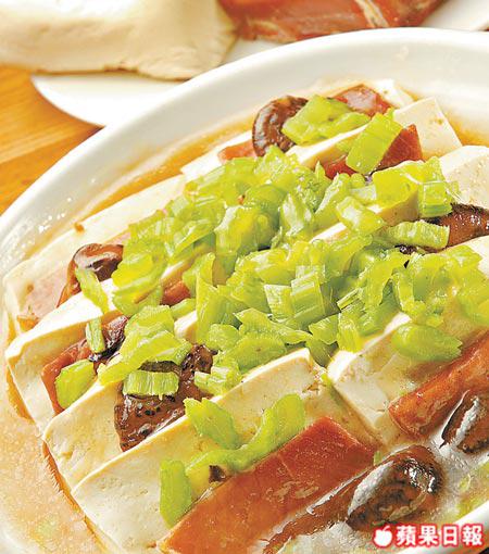 做法:金華火腿蒸45分鐘後切片待用。冬菇浸發後和豆腐切片,與火腿一同排上碟,以大火蒸4分鐘至所有材料熟透,最後埋芡汁淋面即成。