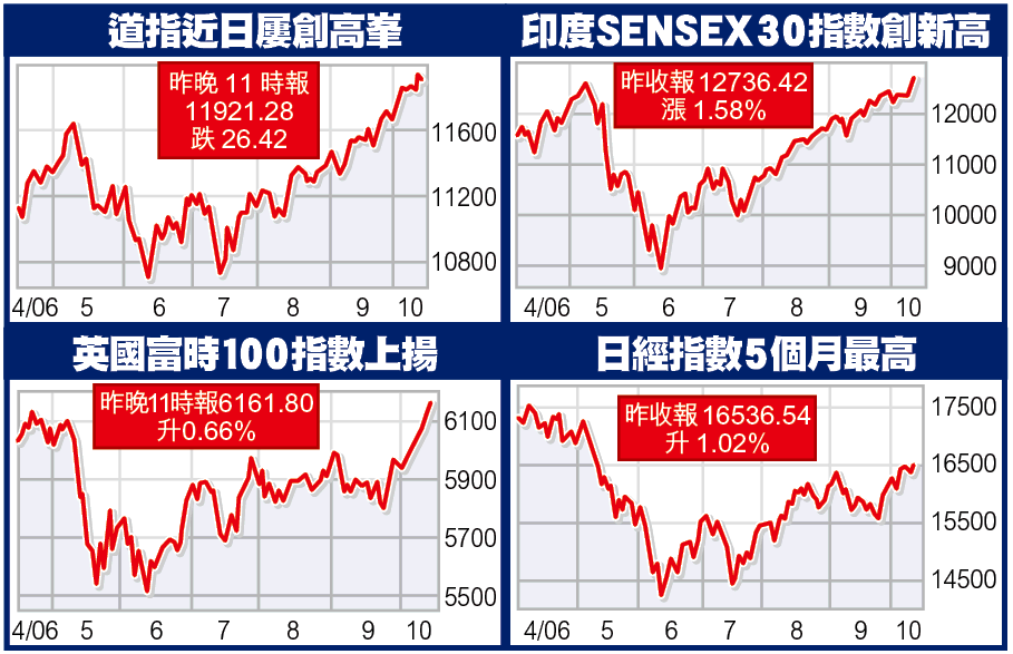 在周四,道指大漲95.57(0.81%),升見11947.70,創下歷來最高收市水平;納指勁揚37.91(1.64%),報2346.18,為半年來收市新高。
