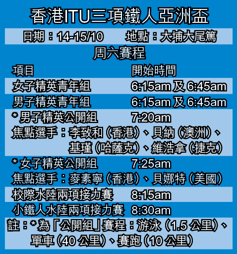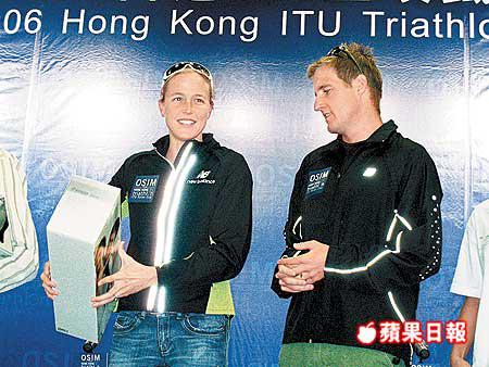 今晨在大尾篤舉行的「OSIM香港ITU三項鐵人亞洲盃」,由於總獎金由去年的40,000多港元加至近195,000港元,故吸引了不少國際選手參賽;包括丈夫是雅典奧運第4名、太太是今年5月世界排名第1的澳洲貝納夫婦,還有悉尼奧運季軍、捷克的維浩拿及99年世界冠軍、哈薩克的基瑾;全部為北京奧運而戰。