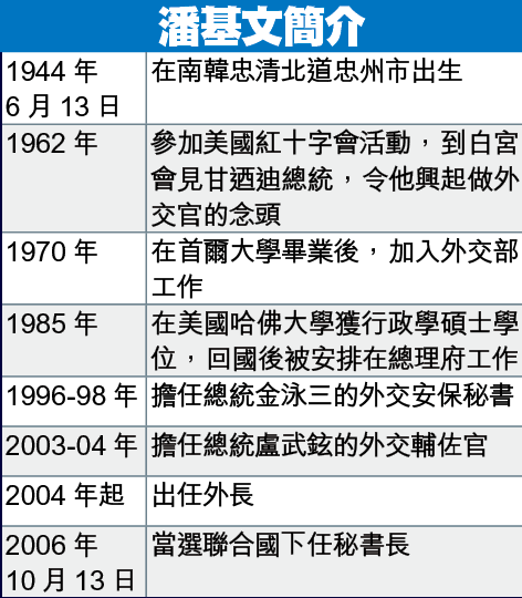 在聯合國大會一致鼓掌下,南韓外長潘基文前日(周五)正式當選下任聯合國秘書長,開展聯合國再次由亞洲人當家的新一頁。不過他沒有空閒去慶祝,內要推動聯合國改革、外要應付北韓核武問題,這位新秘書長注定沒有蜜月期。潘基文還要一再反擊對他領導能力的質疑,宣稱「我低調,但我很果斷」。