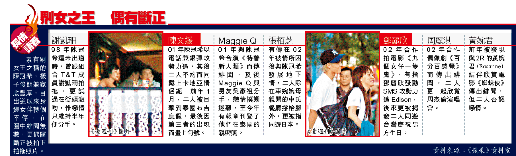 緋聞名單長如流水的Edison曾先後與陳文媛、MaggieQ、鍾欣桐、蔡依林、鄧麗欣及2R成員Rosanne等傳緋聞,從其擇偶品味中,不難看出他鍾情細細粒美少女,而Vincy也屬此類型靚女,加上她曾在港就讀國際學校,性格洋化兼不拘小節,與Edison的我行我素個性可謂合拍之至。