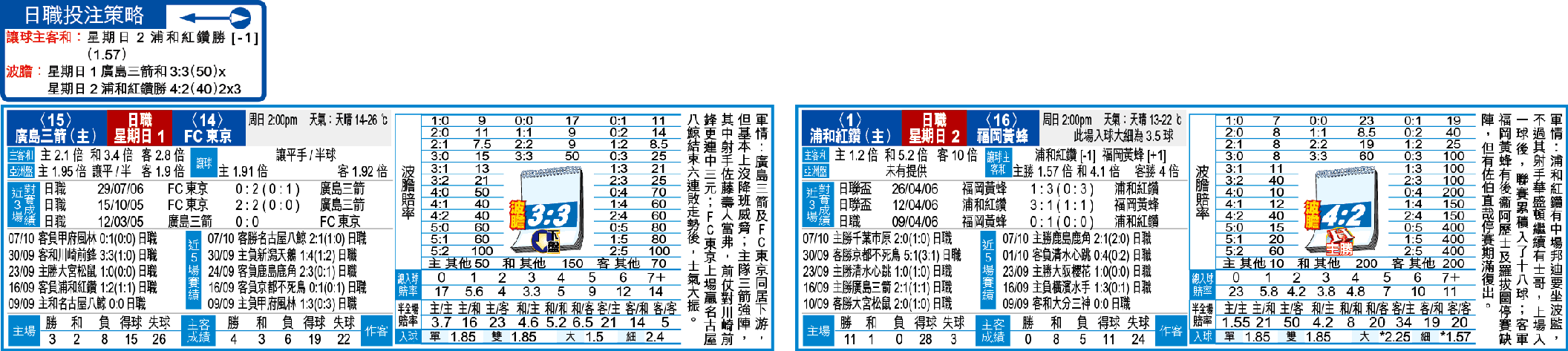 以浦和紅鑽之實力及狀態,周日在日職聯主場對缺3主力的福岡黃蜂,料可輕鬆贏波,故「讓球主客和」讓一球,必吼「主勝」。