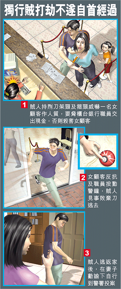 【本報訊】一名失業漢疑因債台高築無力償還,竟想藉打劫還債,昨晨闖入旺角一間銀行以𠝹刀架頸挾持一名女顧客,要脅銀行職員交出現金否則殺害女顧客,女顧客不甘受制反抗掙脫賊人,職員隨即按動警鐘,賊人見事敗棄下𠝹刀逃返家中後兩個多小時,他在妻子的勸喻下,自行到油麻地警署投案。劫案中女事主受輕傷,但拒絕送院。