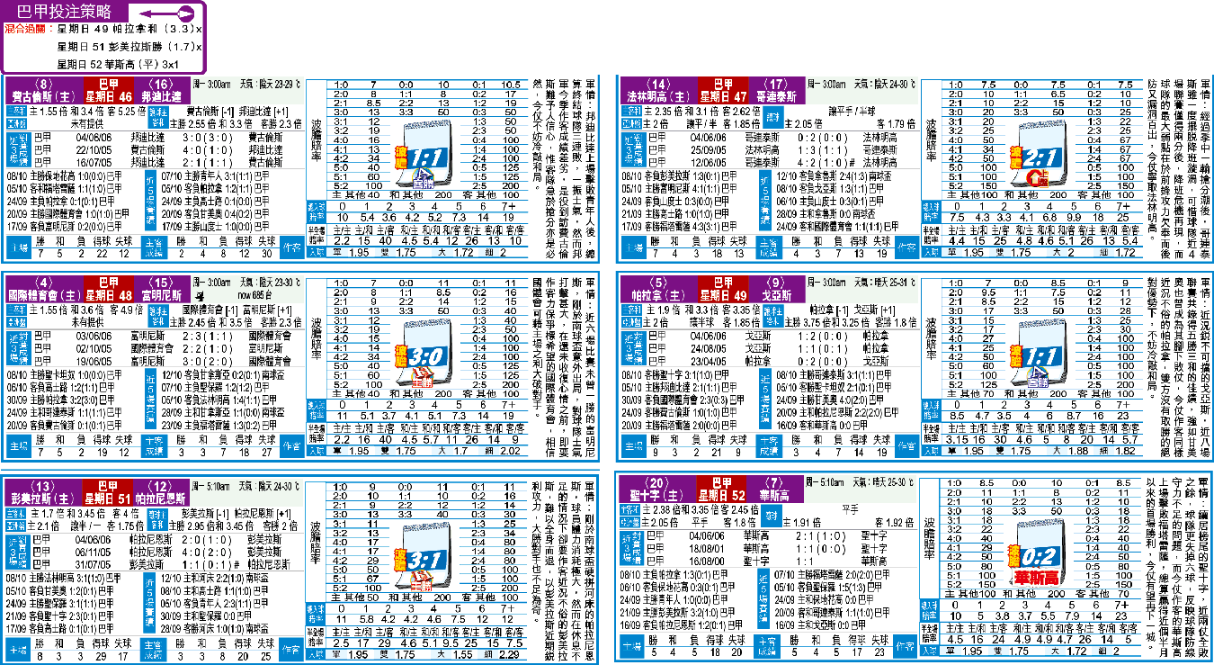 周日上演巴甲第29輪餘下的6場比賽,彭美拉斯近仗盡顯攻力兼例在主場發惡,今主迎兵疲的帕拉尼恩斯可看高一線,單W1.7倍先作重心;串華斯高作客勝「虛火」的聖十字,平手可捧,再射帕拉拿主場與戈亞斯媾和,混合3串1全中有10.7倍回報。