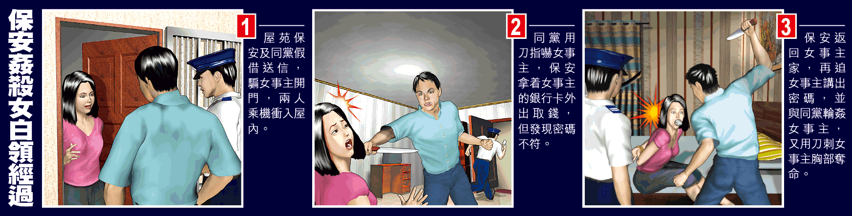 其後,兩人再把女事主雙手綁住,用毛巾塞住其嘴,把她輪姦,因怕事情敗露,決定殺人滅口。李小躍舉刀連刺女事主胸口數下,確認她死亡後兩人才清理現場離開。
